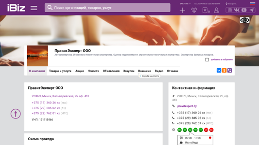 | AI-анализ | The portal Pravitexpert.ibiz.by is a Belarusian business-to-business website for Pravitexpert OOO, offering various expert services including auto expertise, engineering and technical appraisals, real estate appraisals, and appraisals of consumer goods. The website provides contact information, including phone numbers and address, for the company located in Minsk at Kalvaryjskaya 25, office 413. The site offers a scheme for getting there, and operates Monday through Friday from 9:00 AM to 6:00 PM, with no lunch break. The company specializes in oceanochnaia del'nost' or oceanochnaia deyatelnost', which can be translated as 'oceanside business' or 'maritime business', suggesting a focus on industries related to the sea or water. The website does |