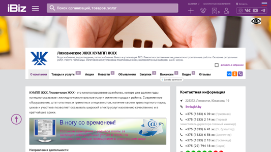 Название / Заголовок | Ляховичское ЖКХ КУМПП ЖКХ - Водоснабжение, водоотведение, теплоснабжение. Вывоз и утилизация ТКО. Ремонтно-сантехнические, ремонтно-строительные работы. Оказание ритуальных услуг. Услуги гостиницы. Изготовление и установка пластиковых окон, железобетонных заборов. Баня. Сауна.. 225372, Ляховичи, , Южакова, 19 |