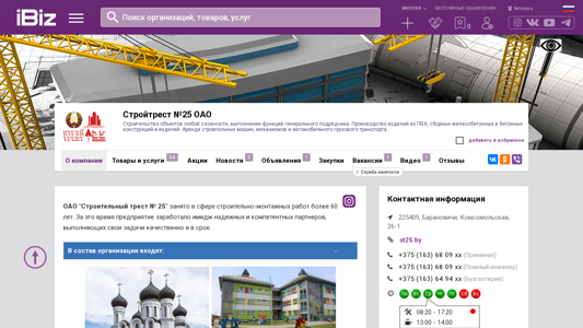 | AI-анализ | This website is for Stroytrest №25 OAO, a construction company based in Baranovichy, Belarus. The company provides construction services for projects of any complexity and acts as a general contractor. They also produce items from PVC, prefabricated and concrete structures and products. The website mentions rental services for construction machinery, mechanisms, and heavy cargo transportation vehicles. The company's address and contact information are provided. The website includes sections for company information, products and services, news, vacancies, and customer reviews on various social media platforms. The company, OAO "Stoiyelnyy trest №25," has been active in the construction industry for over 60 years and has built a reputation for reliable and competent partnerships that deliver quality work on time. The company comprises several divisions including Construction Management No. 145 (SU-1 |