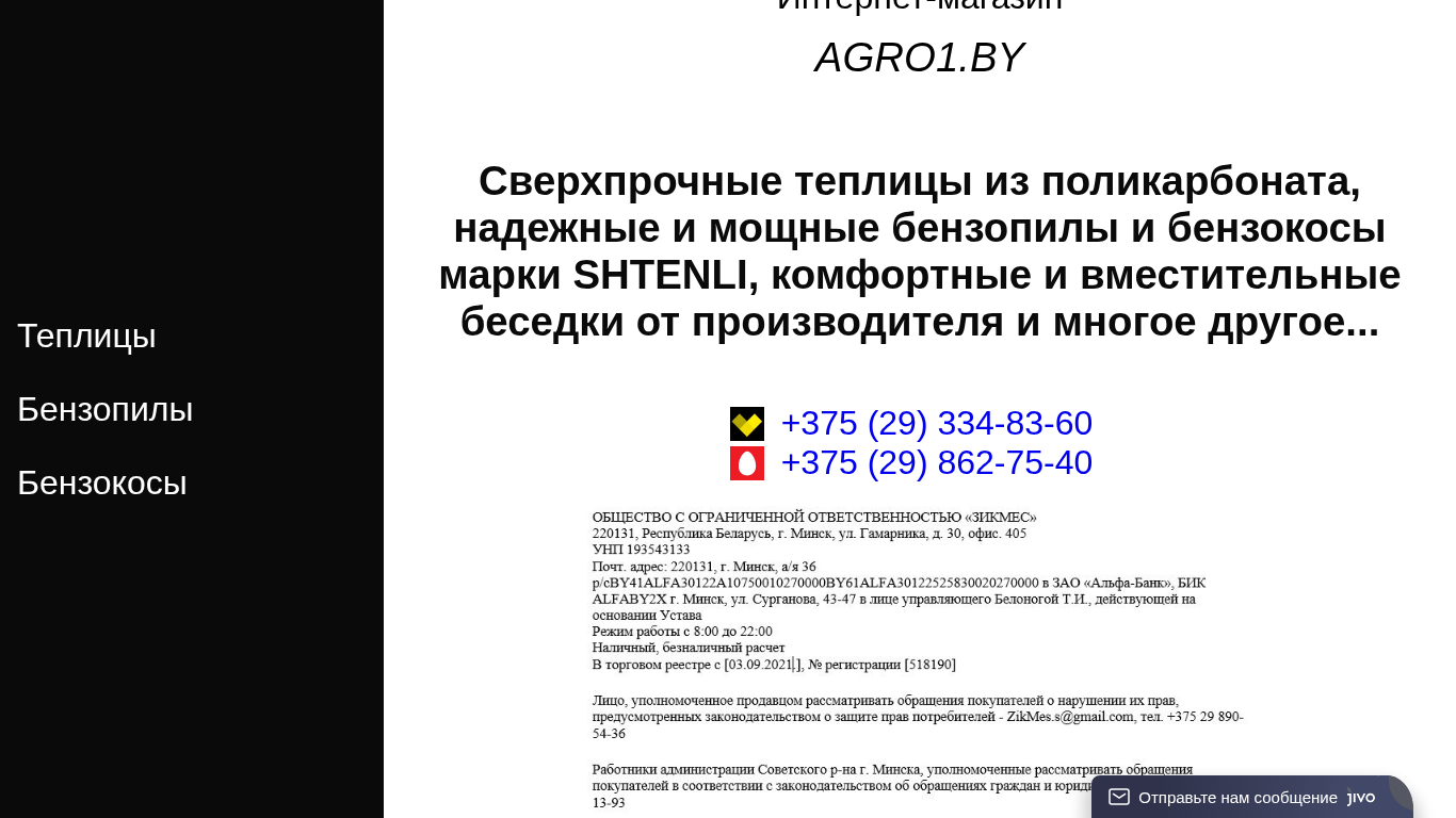 SEO-описание | Официальный производитель сибирских теплиц в Беларуси. Первый поставщик техники shtenli в Беларуси. Низкие цены. Бесплатная Доставка. Гарантия на Товар. Большие скидки до 50% |
