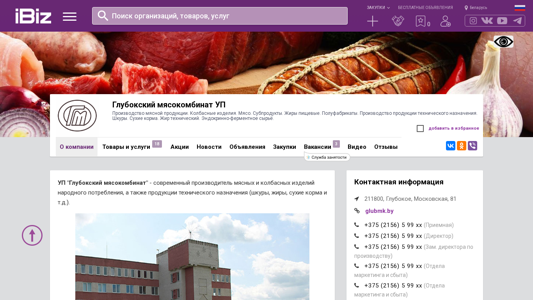 Название / Заголовок | Глубокский мясокомбинат УП - Производство мясной продукции. Колбасные изделия. Мясо. Субпродукты. Жиры пищевые. Полуфабрикаты. Производство продукции технического назначения. Шкуры. Сухие корма. Жир технический. Эндокринно-ферментное сырьё.. 211800, Глубокое, , Московская, 81 |