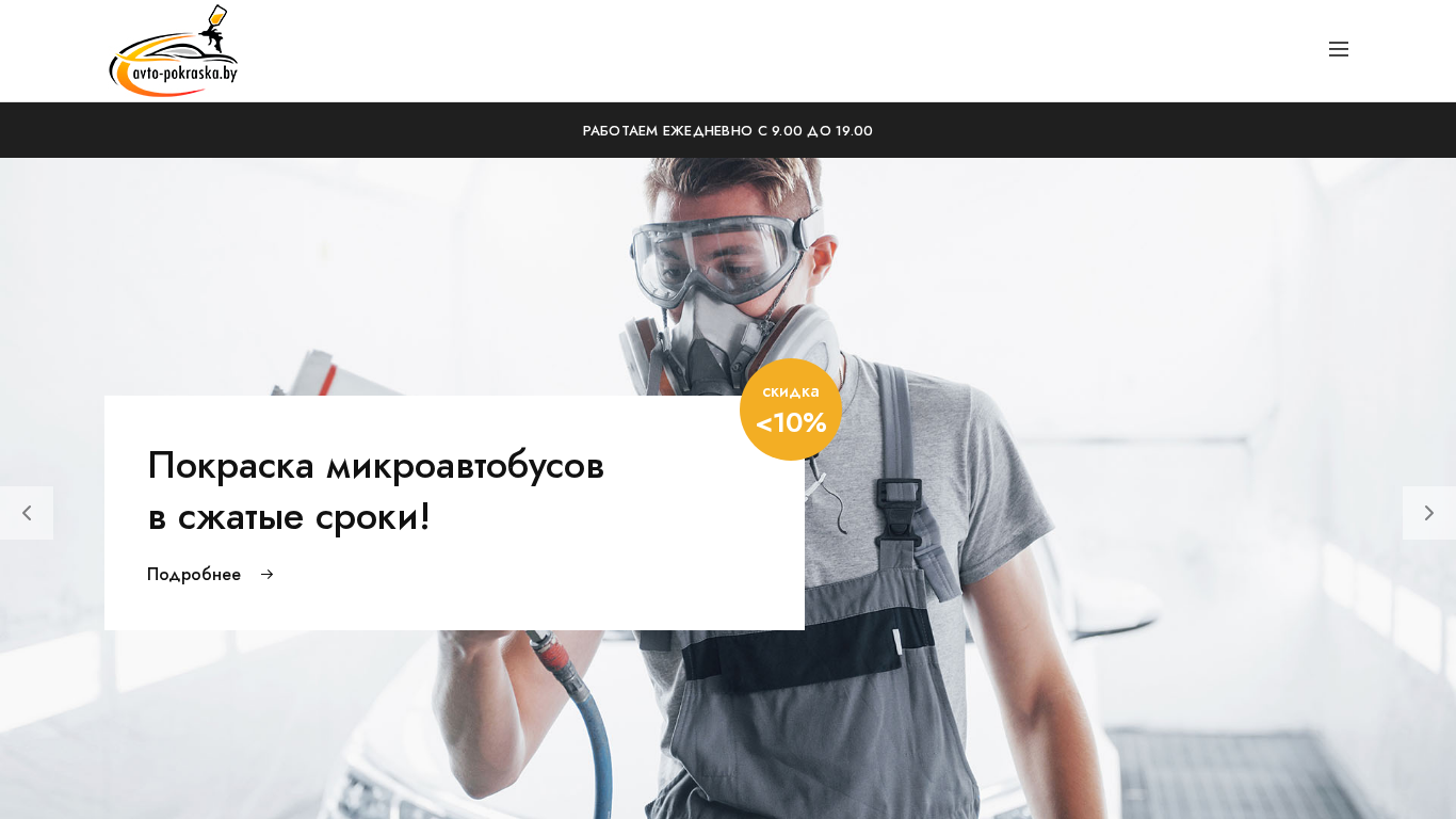 | SEO-описание | Кузовной ремонт и покраска легковых автомобилей и микроавтобусов в центре Минска. Работаем ежедневно с 9.00 до 18.00. Узнайте наши цены! |