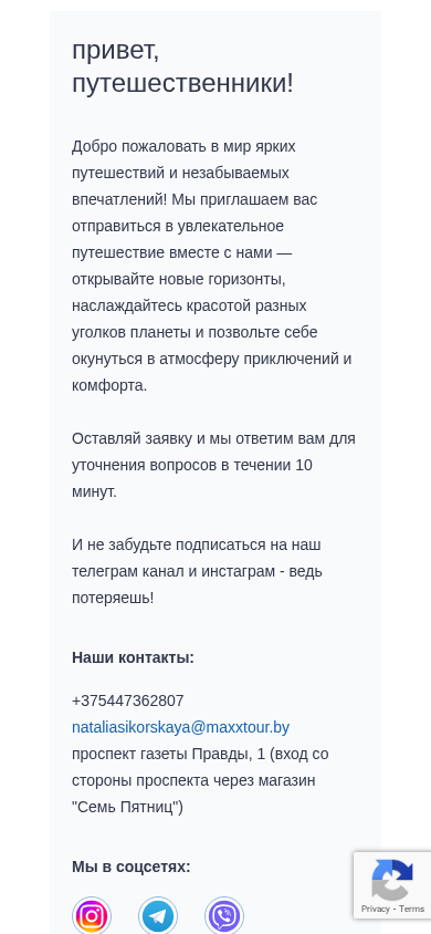 SEO-описаниеДобро пожаловать в мир ярких путешествий и незабываемых впечатлений! Мы приглашаем вас отправиться в увлекательное путешествие вместе с нами — открывайте новые горизонты, наслаждайтесь красотой разных уголков планеты и позвольте себе окунуться в атмосферу приключений и комфорта. Оставляй заявку и мы ответим вам для уточнения вопросов в течении 10 минут. И не забудьте подписаться на наш телеграм канал и инстаграм - ведь потеряешь!