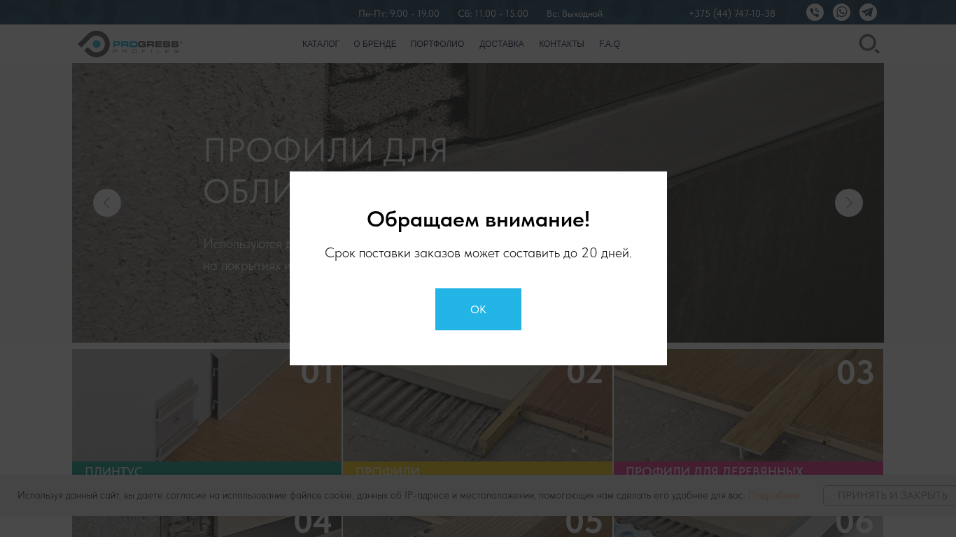 SEO-описаниеЗакажите плинтус напольный PROGRESS PROFILES, профиль для ступеней, напольных покрытий, облицовок, балконов, террас в Минске. Доставка по Беларуси. Оплата онлайн. Звоните +375 (44) 747-10-38