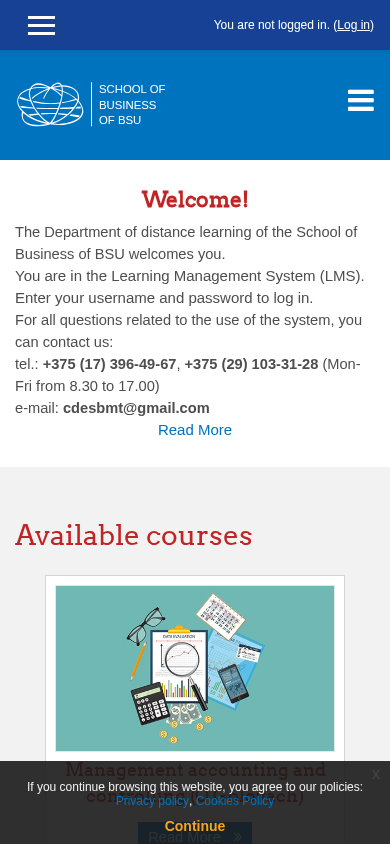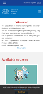 | AI-анализ | The portal eng.sbcde.by is a learning management system operated by the Department of distance learning of the School of Business of BSU. Users can log in to access various courses, including management accounting and controlling, crisis management, business planning, management, organization of entrepreneurial activity, risk-management, e-business, and SRL. The system includes a schedule, contact information for support, and links to the department's website, blog, and electronic catalog of the library. The site is available in both Russian and English. |