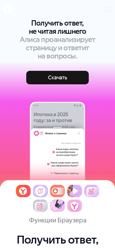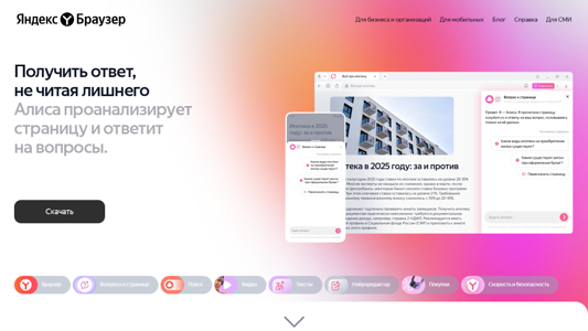 | AI-анализ | This website is for downloading the Yandex Browser. The description states that the browser has been updated to include neuronetworks, which help users write powerful texts, create images, understand different languages, read texts, and watch videos in summary form. The top words for this website include 'download', 'browser', 'video', 'texts', 'questions', 'translations', 'neuronetworks', 'GPT', 'Neurosapiens', 'turbo mode', 'search', 'websites', 'Internet', 'safely', and 'free'. The website offers features such as quick answers, finding solutions, text and video translation, and a neurotext editor. It also offers savings on purchases with cashback, promo codes, and installment payment options. The browser is described as fast, secure, and convenient, with the ability to transfer data easily. The website includes sections for |