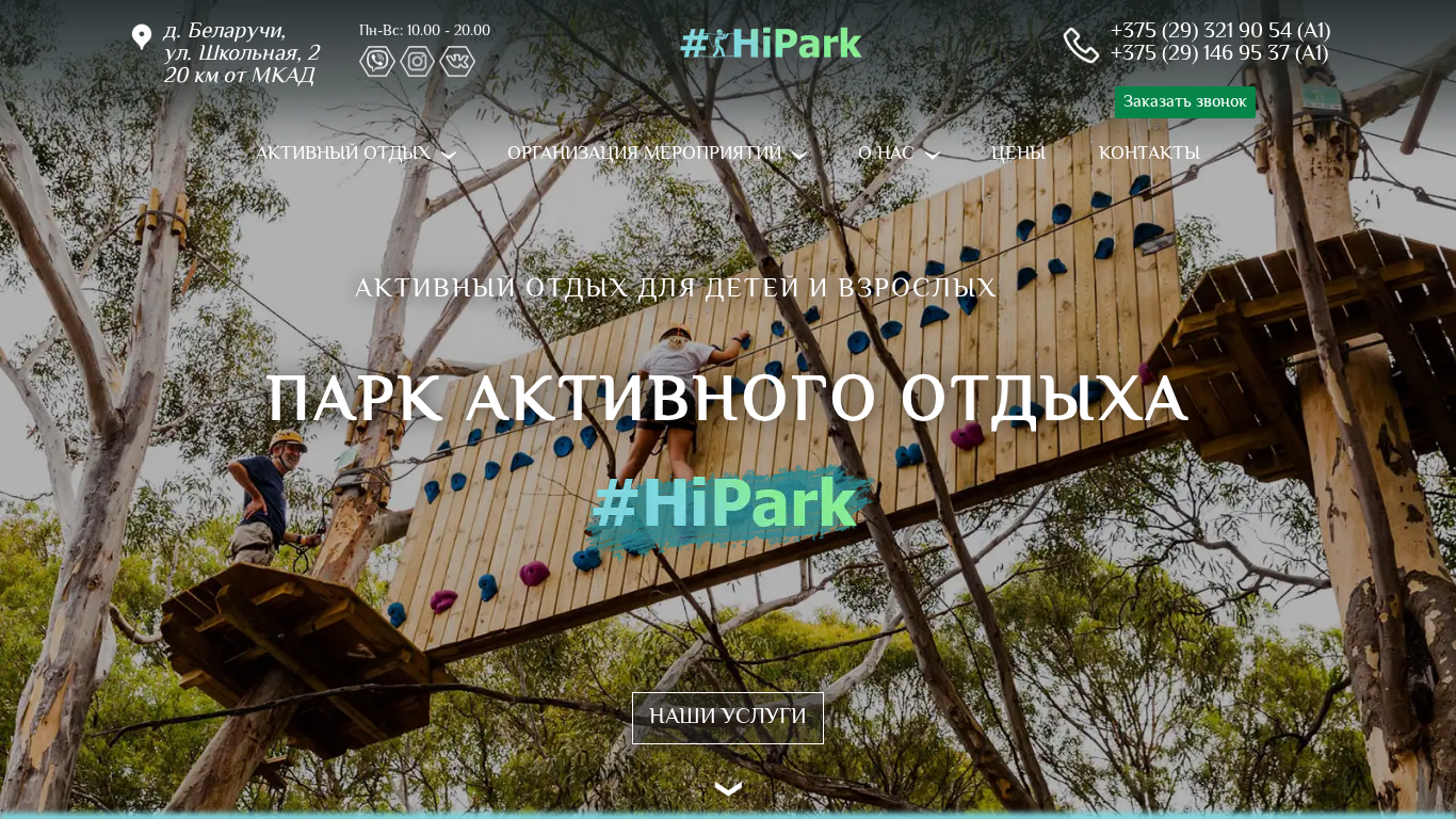 SEO-описание | Площадка активного отдыха HiPark приглашает детей и взрослых весело и интересно провести время и праздники. ✔ Парк в 20 км от Минска. ✔ Много зон развлечений. ✆ +375 (29) 321 90 54. Предварительная запись на услуги обязательна! |