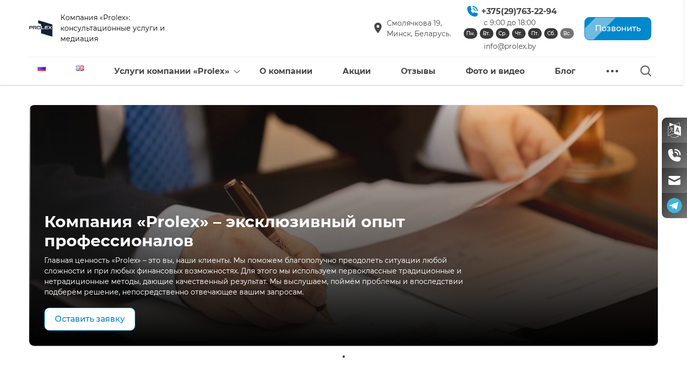 SEO-описание | Компания "Prolex" специализируется на разрешении споров, регистрации и ликвидации бизнеса, медиации, консультации по правовым вопросам в РБ |