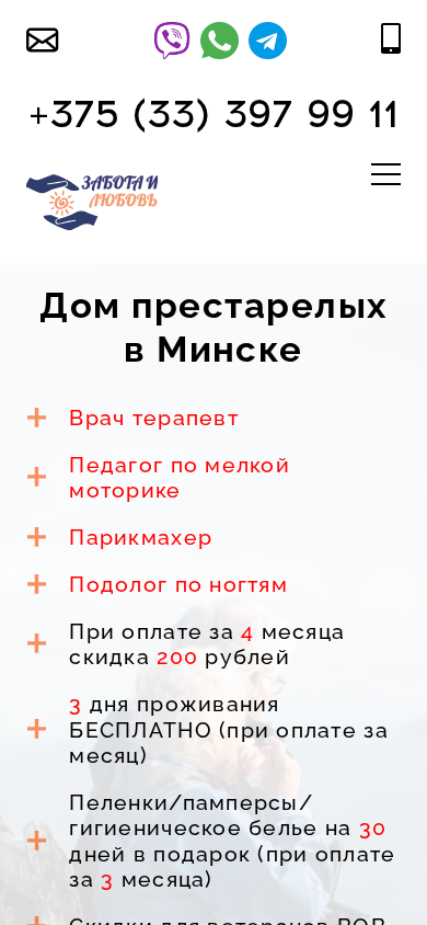 SEO-описание | Частный дом престарелых в Минске и пожилых людей «Забота и любовь». Бережный уход в пансионате для людей с заболеваниями. Комфортное проживание, многоразовое питание и досуг. Звоните!☎️ |