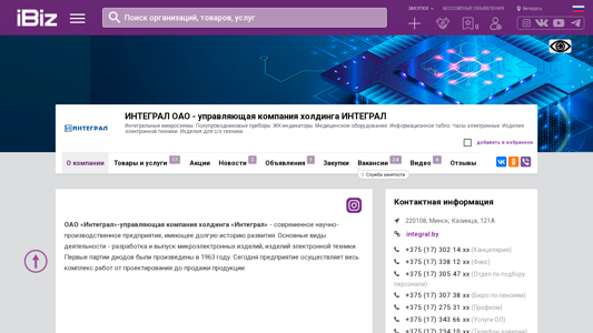 Название / ЗаголовокИНТЕГРАЛ ОАО - управляющая компания холдинга ИНТЕГРАЛ - Интегральные микросхемы. Полупроводниковые приборы. ЖК-индикаторы. Медицинское оборудование. Информационное табло. Часы электронные. Изделия электронной техники. Изделия для с/х техники.. 220108, Минск, , Казинца, 121А