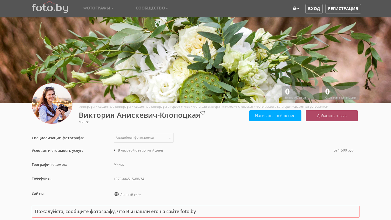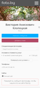 | AI-анализ | --- The portal akva.foto.by is dedicated to the work of photographer Victoria Aniskevich-Klopotskaya from Minsk, Belarus. The main focus of the site is on her photography in the 'Wedding' category. Victoria has been a photographer for over 6 years and offers her services in Minsk, Belarus, and Europe. Her goal is to make her clients happy. The site includes a catalog of photographers, a community of photographers, and various resources for photography. The site was visited on December 20, 2021, and currently has no reviews in the 'Wedding' category. Victoria's specialties include wedding, New Year's Eve sessions, and family photography. Her pricing and shooting location information are not provided on the site. The site also includes contact information and links to her personal website. |