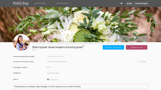 | SEO-описание | Фотографии в категории "Свадебная фотосъемка". Рада приветствовать Вас на моей страничке! Меня зовут Вика. Я занимаюсь фотографией уже более 6 лет. Снимаю в Минске, по всей Беларуси и в Европе. Для меня главная цель - счастливые глаза клиента =) |