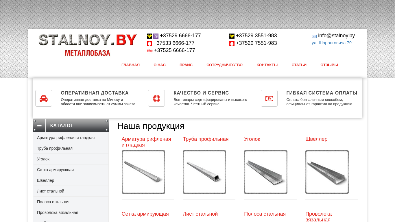 SEO-описаниеОптово-розничная металлобаза STALNOY. Широкий ассортимент металлопроката. Здесь можно купить арматуру в Минске, узнать стоимость труб, купить уголки металлические, купить швеллер. Наличный и безналичный расчет, оптом и в розницу. Резка металла в размер заказчика. Доставка.