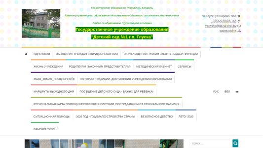 | AI-анализ | This online resource belongs to the website of Kindergarten No.1 in the city of Glusk, under the Ministry of Education of the Republic of Belarus. The main pages of the website are managed by the Glusk District Executive Committee's Education Department. The Kindergarten is a state educational institution located on Kirov Street, 96a, in Glusk. Contact information includes a phone number (+375-2230-78-166) and email address (verasok@glusk.edu.by). The website includes sections for administrative procedures, contacts, and a phone directory. It also features a map of the site, a single-window service, and pages for working with personnel data, normative documents, and citizen appeals. The kindergarten's schedule, admission procedures, and "direct" phone lines are also provided. There are sections for frequently asked questions |