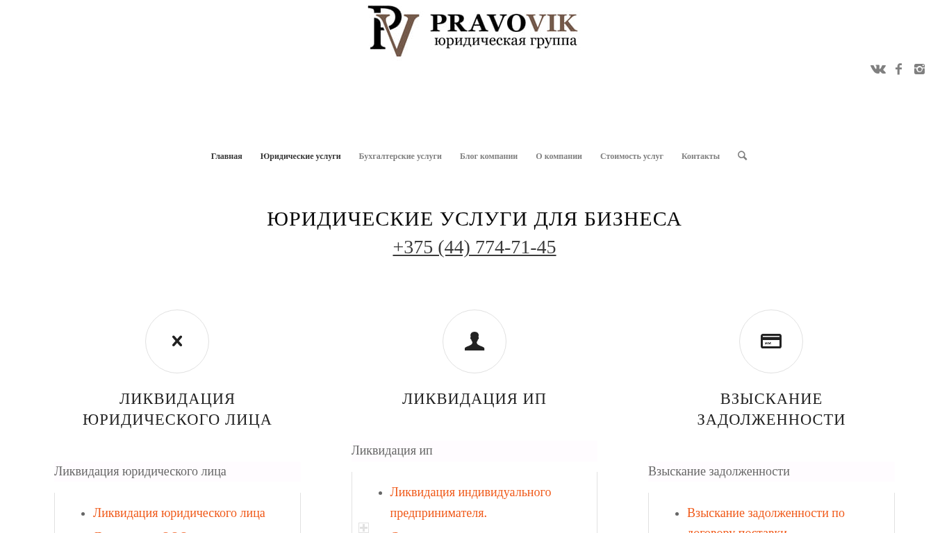 | SEO-описание | Юридические услуги для бизнеса "Правовик" - юридическая группа в Минске и РБ. Регистрация ООО. Ликвидация ООО, ИП. Банкротство ООО. |