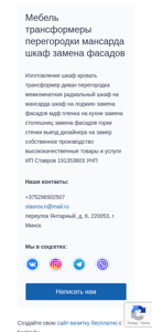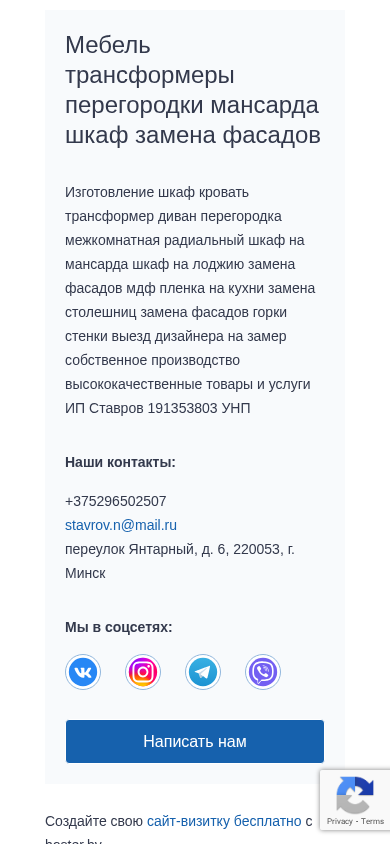 SEO-описаниеИзготовление шкаф кровать трансформер диван перегородка межкомнатная радиальный шкаф на мансарда шкаф на лоджию замена фасадов мдф пленка на кухни замена столешниц замена фасадов горки стенки выезд дизайнера на замер собственное производство высококачественные товары и услуги ИП Ставров 191353803 УНП