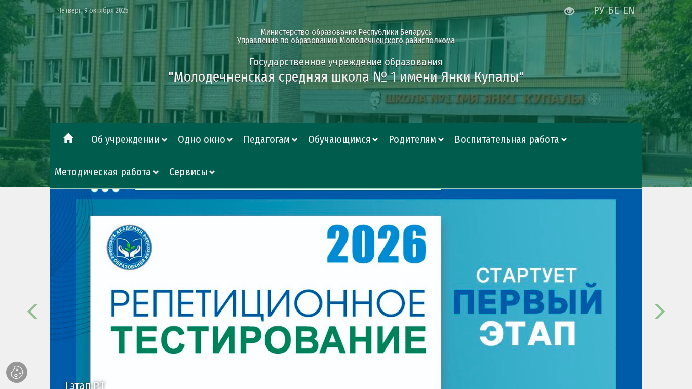 | AI-анализ | The web project is a government educational institution website in Belarusian language for Mолодечненская средняя школа № 1 имени Янки Купалы (Molodechno Secondary School No. 1 named after Jan Kupala). The website provides information about the school, its history, traditions, and achievements, as well as details on its leadership, faculty, and various educational programs. Users can find information on the school schedule, rules, and contact details. The website also features interactive content, such as an interactive map and a museum, as well as electronic services for teachers and students. The site's top keywords include 'подробнее' (detailed), '2025', 'октября' (October), 'образования' (education), 'работы' (work), 'беларусь' (Belarus), 'школа |