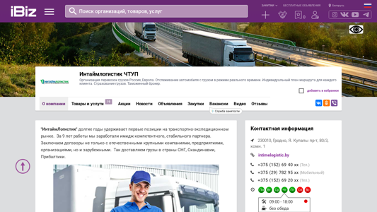 Название / Заголовок | Интаймлогистик ЧТУП - Организация перевозок грузов Россия, Европа. Отслеживание автомобиля с грузом в режиме реального времени. Индивидуальный план маршрута для каждого клиента. Страхование грузов. Таможенный брокер.. 230010, Гродно, , Я. Купалы пр-т, 80/3, комн. 1 |