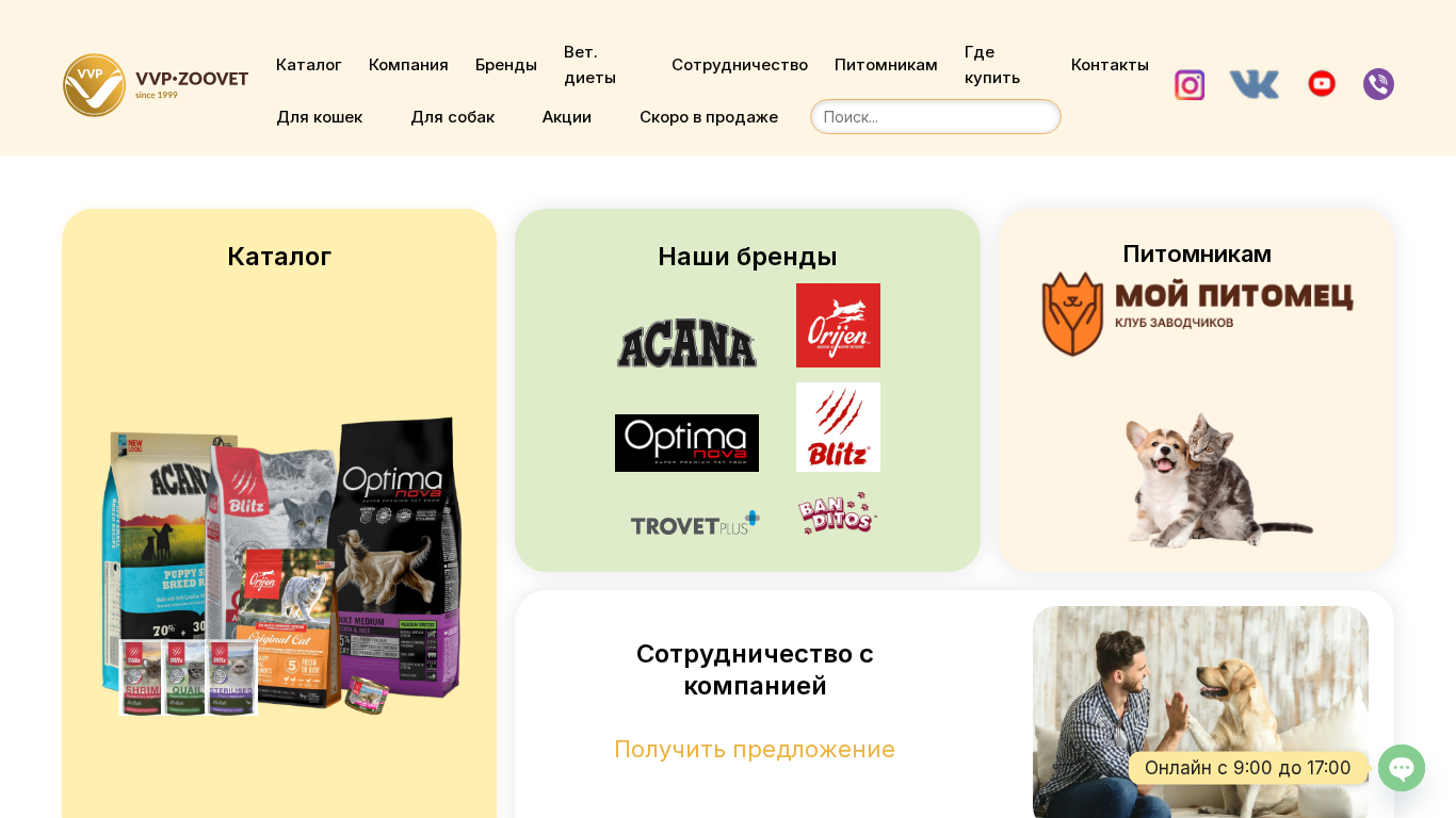 SEO-описание | Компания «ВВП-ЗооВет» более 20 лет на рынке Зооиндустрии! Импортер кормов супер-премиум, холстик классов и ветеринарных диет для кошек и собак от мировых производителей. Компания предлагает новую концепцию для ваших домашних любимцев: питание по законам природы, используя новейшие технологии производства, высокое качество ингредиентов от брендов Optimanova/Испания, Blitz/Россия. Представляем уникальные ветеринарные рационы Trovet+/Испания и Blitz Vetline/Россия |