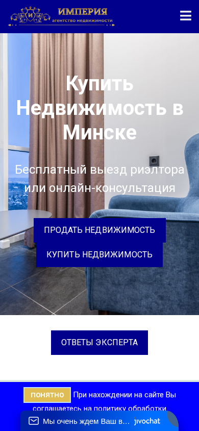 --- The website is for the real estate agency "Империя города" based in Minsk, Belarus. The company offers solutions for property transactions in Minsk on favorable terms. Keywords include real estate, agency, Minsk, apartments, studios, cottage, house, land, commercial property, services, career, news, company, contacts. The website is available in BYN, USD, and EUR currencies, and offers a free realtor visit or online consultation. The agency has been active on the market for over 8 years and operates in 50 cities across 4 countries. They are reachable 24/7 and offer over 20 channels for attracting buyers. The website features vacancies for employment and allows users to submit applications or contact a manager. The agency provides consultation, contract negotiation, document preparation, and transaction execution. Client testimonials