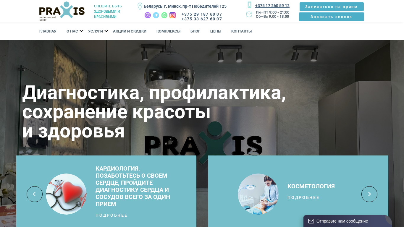 | SEO-описание | Диагностика и лечение всех видов заболеваний. Консультация квалифицированных специалистов. Медицинский центр Praxis. Минск, пр-т Победителей 125. |
