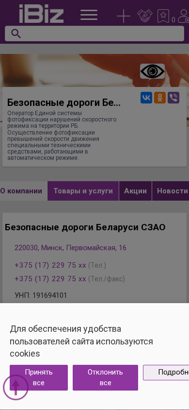 Название / Заголовок | Безопасные дороги Беларуси СЗАО - Оператор Единой системы фотофиксации нарушений скоростного режима на территории РБ. Осуществление фотофиксации превышений скорости движения специальными техническими средствами, работающими в автоматическом режиме.. 220030, Минск, , Первомайская, 16 |