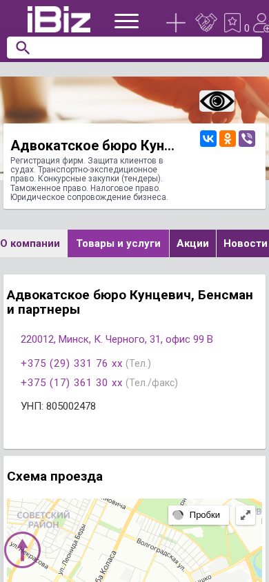 Название / Заголовок | Адвокатское бюро Кунцевич, Бенсман и партнеры - Регистрация фирм. Защита клиентов в судах. Транспортно-экспедиционное право. Конкурсные закупки (тендеры). Таможенное право. Налоговое право. Юридическое сопровождение бизнеса.. 220012, Минск, , К. Черного, 31, офис 99 В |