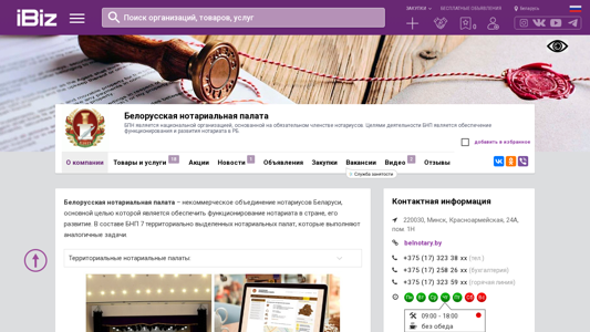 Название / Заголовок | Белорусская нотариальная палата - БПН является национальной организацией, основанной на обязательном членстве нотариусов. Целями деятельности БНП является обеспечение функционирования и развития нотариата в РБ.. 220030, Минск, , Красноармейская, 24А, пом. 1Н |