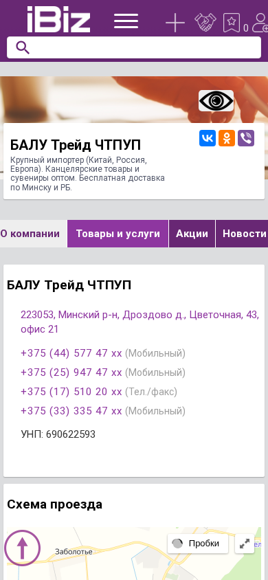 SEO-описание | БАЛУ Трейд ЧТПУП - Крупный импортер (Китай, Россия, Европа). Канцелярские товары и сувениры оптом. Бесплатная доставка по Минску и РБ.. Схема проезда, контактные телефоны, адрес компании БАЛУ Трейд ЧТПУП. 223053, , Дроздово д., Цветочная, 43, офис 21 |