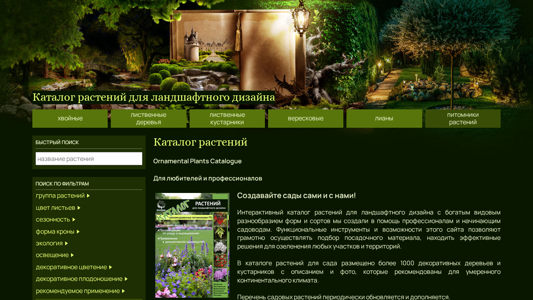 SEO-описание | Каталог растений для ландшафтного дизайна, более 1000 сортов садовых декоративных растений с фото и описанием как сделать сад своими руками, быстрый поиск и подбор. |