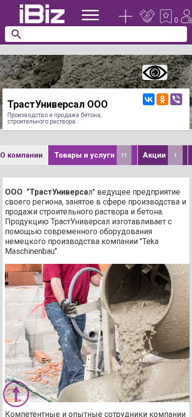 Название / ЗаголовокТрастУниверсал ООО - Производство и продажа бетона, строительного раствора.. 222201, Смолевичи, Вокзальная, 3Д
