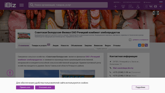 Название / Заголовок | Советская Белоруссия Филиал ОАО Речицкий комбинат хлебопродуктов - Выращивание крупного рогатого скота и свиней. Производство и реализация молока. Выращивание зерновых, картофеля, кормовых и технических культур. Производство продукции растениеводства. Переработка мяса. КХП. . 247501, , Заспа аг., Колхозная, 13 |