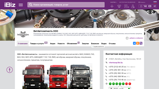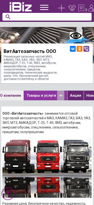 Название / Заголовок | ВитАвтозапчасть ООО - Реализация запасных частей МАЗ, КАМАЗ, ГАЗ, ВАЗ, УАЗ, ЗИЛ, МТЗ, АМКАДОР, Т-25, Т-40, ЯМЗ, автобусов, микроавтобусов, спецтехники, сельхозтехники, прицепов, полуприцепов, технические жидкости, шины. Опт, безналичный расчёт, доставка по Витебску и области.. 210021, Витебск, , 4-ая Заслонова, 1Ж-24 |