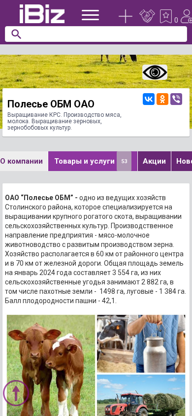 Название / Заголовок | Полесье ОБМ ОАО - Выращивание КРС. Производство мяса, молока. Выращивание зерновых, зернобобовых культур.. 225555, , Ольгомель д., Новая, 53 |