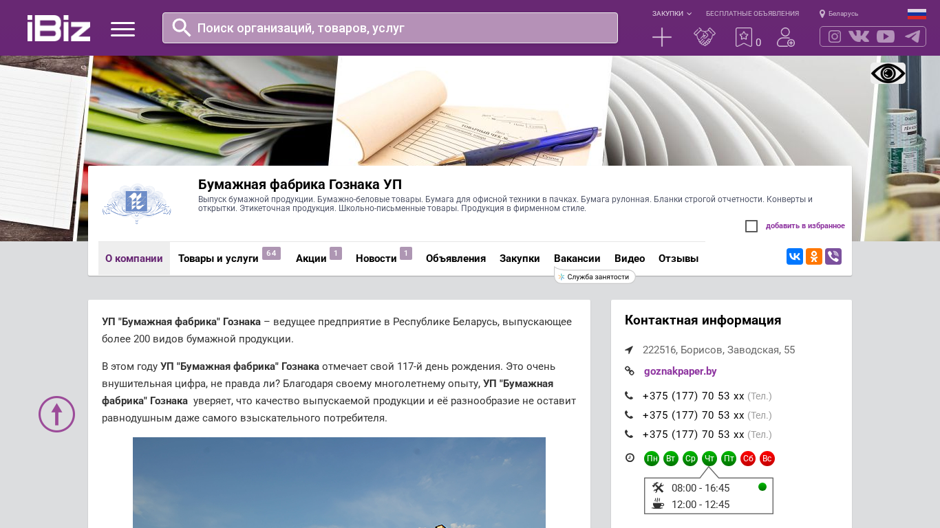 Название / ЗаголовокБумажная фабрика Гознака УП - Выпуск бумажной продукции. Бумажно-беловые товары. Бумага для офисной техники в пачках. Бумага рулонная. Бланки строгой отчетности. Конверты и открытки. Этикеточная продукция. Школьно-письменные товары. Продукция в фирменном стиле.. 222516, Борисов, , Заводская, 55