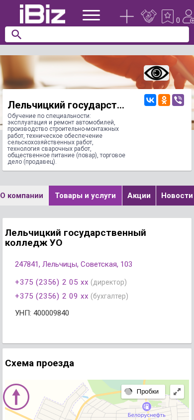 Название / Заголовок | Лельчицкий государственный колледж УО - Обучение по специальности: эксплуатация и ремонт автомобилей, производство строительно-монтажных работ, техническое обеспечение сельскохозяйственных работ, технология сварочных работ, общественное питание (повар), торговое дело (продавец).. 247841, Лельчицы, , Советская, 103 |