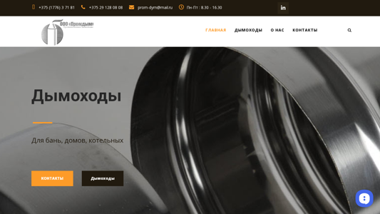 | AI-анализ | --- This online resource is an e-commerce platform for purchasing chimneys in Minsk, Belarus, with delivery options. The title of the website is "Купить дымоход в Минске с доставкой" (Buy a chimney in Minsk with delivery). The description contains keywords related to chimneys, steel, maps, and standard and non-standard elements. The website offers various types of chimneys, including one-piece, sandwich (insulated), and coaxial chimneys, as well as tubes and elements for mounting. The company, OOO "Промдым," produces chimneys in Belarus. The website includes a section for contacts, which lists a phone number and an email address, and operating hours from Monday to Friday, 8:30-16:30. The website also offers custom production without price increase and cert |