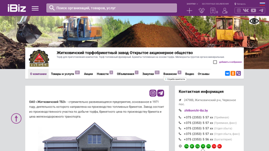 | AI-анализ | --- The portal tbz.ibiz.by is dedicated to the Open Joint Stock Company "Житковичский Торфобрикетный Завод" (Zhitkovichsky Torfobriketny Zavod), offering torf products for various purposes. The company specializes in the production of torf-based fuel bricks, torf frezerny (fresher torf) for producing fuel bricks, and melioranty grundov organo-mineralnye (organic-mineral ground meliorants). The website includes sections for company information, products, and services, as well as job vacancies, news, and announcements. The company's offerings include fuel bricks, torf for compost preparation, torf frezerny for power generation, and ground meliorants for landscaping and rehabilitating damaged territor |