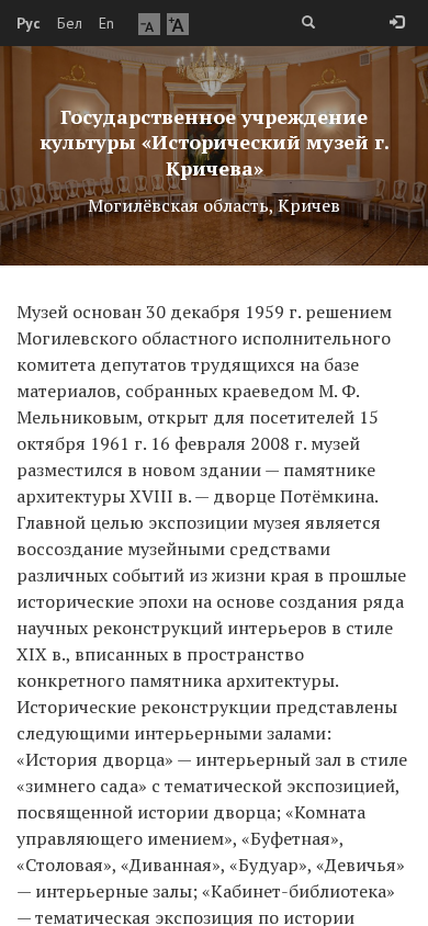 SEO-описание | Государственное учреждение культуры «Исторический музей г. Кричева» — новости и афиша мероприятий, информация для посетителей, цены, экспозиция, коллекции, материалы для музейщиков. |