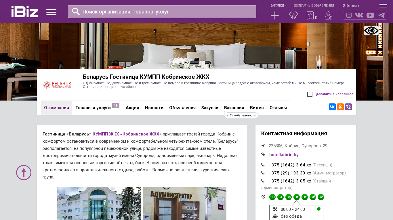Название / Заголовок | Беларусь Гостиница КУМПП Кобринское ЖКХ - Однокомнатные, двухкомнатные и трехкомнатные номера в гостинице Кобрина. Гостиница рядом с аквапарком, комфортабельные многокомнатные номера. Организация спортивных сборов.. 225306, Кобрин, , Суворова, 29 |