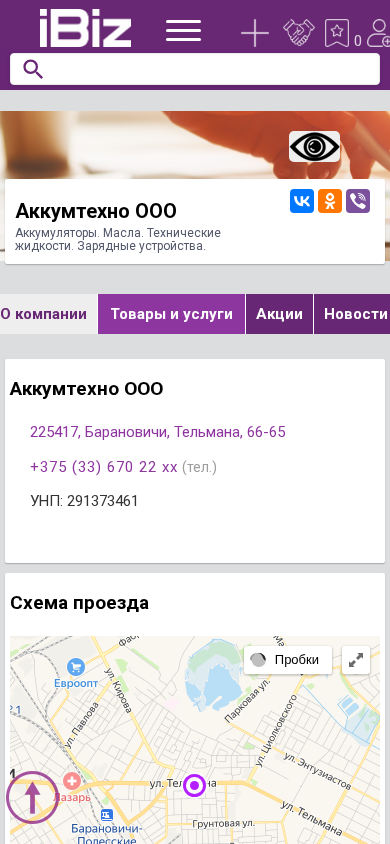 Название / Заголовок | Аккумтехно ООО - Аккумуляторы. Масла. Технические жидкости. Зарядные устройства.. 225417, Барановичи, , Тельмана, 66-65 |