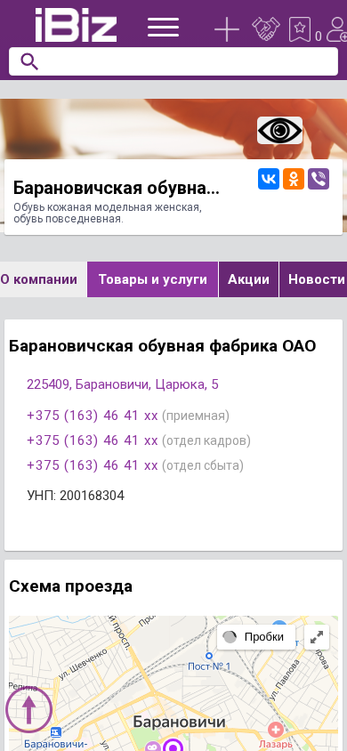SEO-описание | Барановичская обувная фабрика ОАО - Обувь кожаная модельная женская, обувь повседневная.. Схема проезда, контактные телефоны, адрес компании Барановичская обувная фабрика ОАО. 225409, Барановичи, , Царюка, 5 |