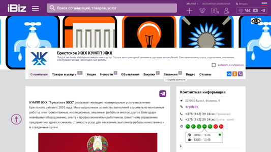 Название / Заголовок | Брестское ЖКХ КУМПП ЖКХ - Предоставление жилищно-коммунальных услуг. Услуги автотракторной техники и грузовых автомобилей. Сантехнические услуги, отделочные, земляные, электромонтажные, изоляционные работы.. 224005, Брест, , Фомина, 4 |