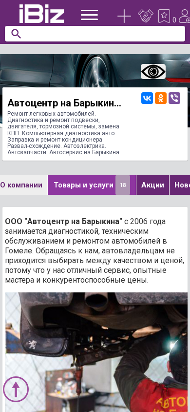 Название / ЗаголовокАвтоцентр на Барыкина ООО - Ремонт легковых автомобилей. Диагностика и ремонт подвески, двигателя, тормозной системы, замена КПП. Компьютерная диагностика авто. Заправка и ремонт кондиционера. Развал-схождение. Автоэлектрика. Автозапчасти. Автосервис на Барыкина.. 246020, Гомель, , Барыкина, 297А