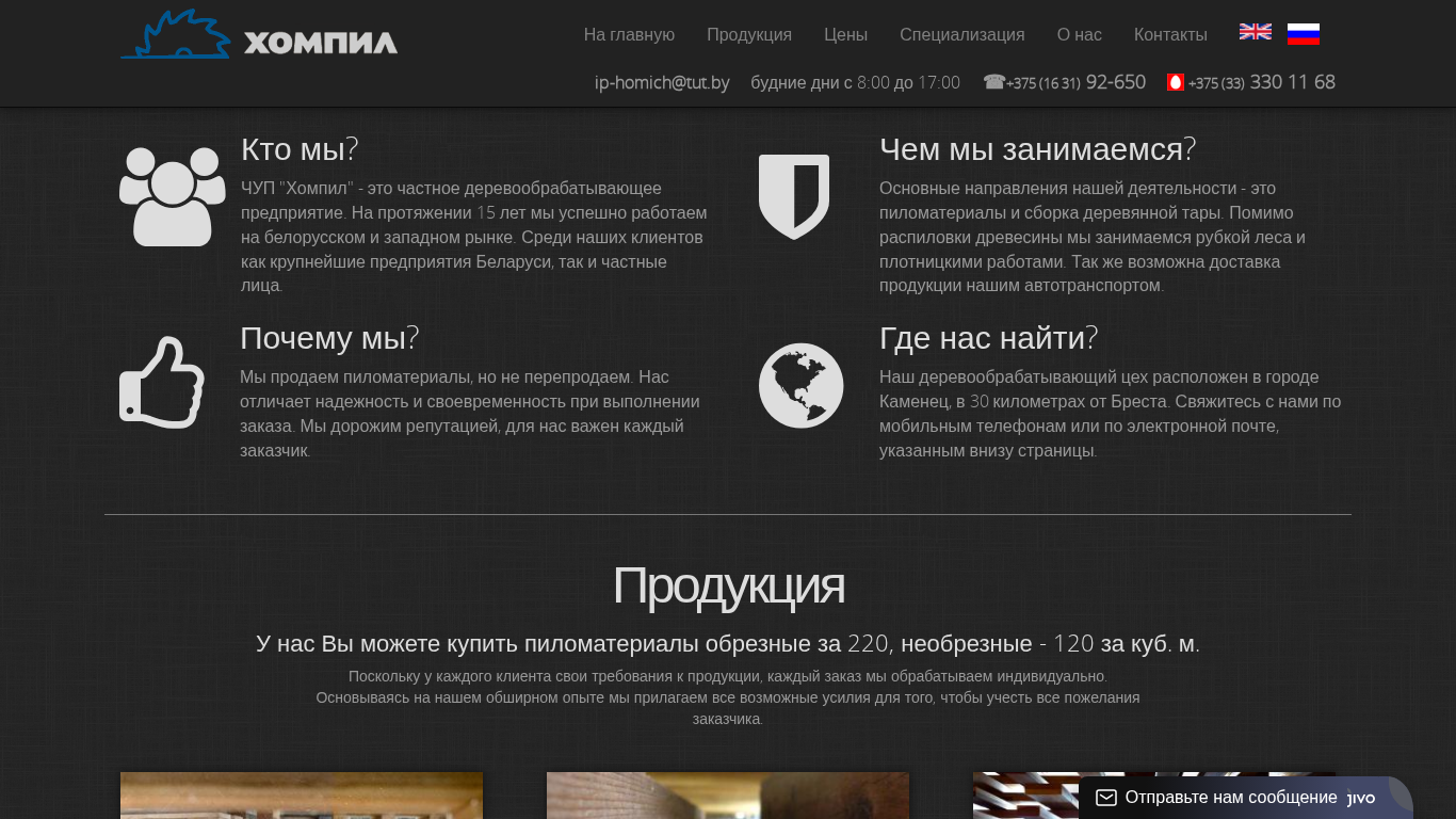 SEO-описание | ★ Hompil is a private woodworking company specializing in winter and summer wood, timber, pallets, boards, beams, rafters, sheathing, containers, slabs, fences, firewood, wall paneling, wood scraps and sawdust. We are located in the city of Kamenets, Belarus which is 40 km from the Eastern border of the EU ★ |