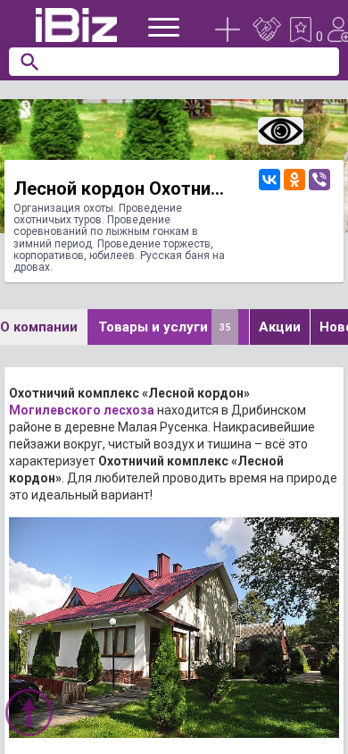 | Название / Заголовок | Лесной кордон Охотничий комплекс Могилевский лесхоз - Организация охоты. Проведение охотничьих туров. Проведение соревнований по лыжным гонкам в зимний период. Проведение торжеств, корпоративов, юбилеев. Русская баня на дровах.. 213971, , Малая Русенка д., 2, 27 км от Могилева |