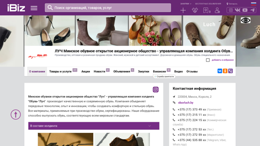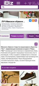 Название / Заголовок | ЛУЧ Минское обувное открытое акционерное общество - управляющая компания холдинга Обувь-Луч - Производство, оптовая и розничная продажа обуви. Женский, мужской и детский ассортимент. Дорожная и домашняя обувь. Обувь специального назначения.. 220004, Минск, , Короля, 2 |