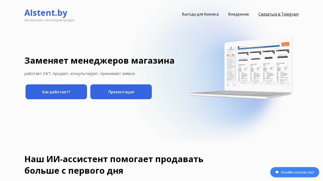 SEO-описание | ИИ ассистент обеспечивает рост прибыли, экономит ресурсы интернет магазина, увеличивает средний чек, способен заменить менеджеров. |
