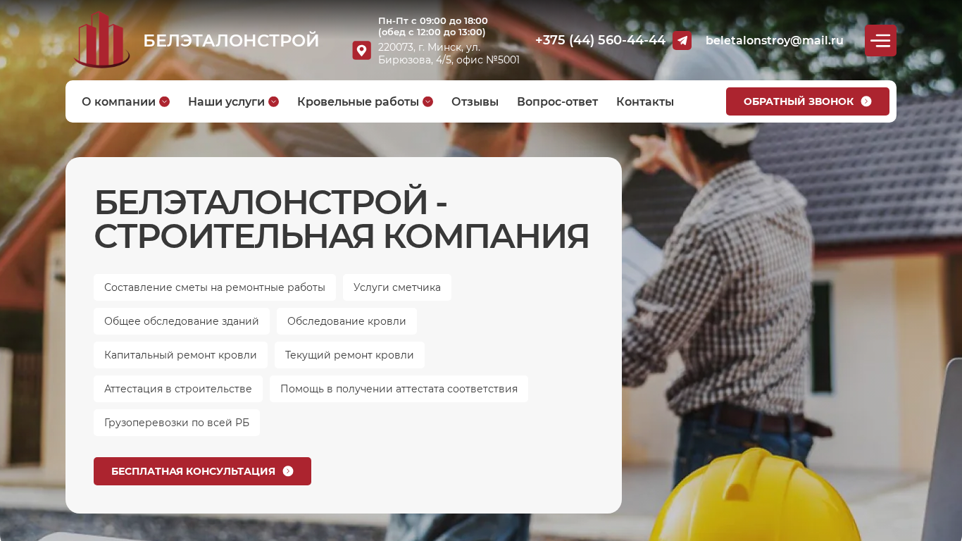 SEO-описаниеООО «‎БЕЛЭТАЛОНСТРОЙ»‎ оказывает услуги по ✔️Обследование кровли ✔️ Капитальный ремонт кровли ✔️ Разработка смет✔️Аттестация в строительстве ➤ 10+ лет на рынке ➤ 40+ выполненных проектов ☎️ +375(44) 560-44-44