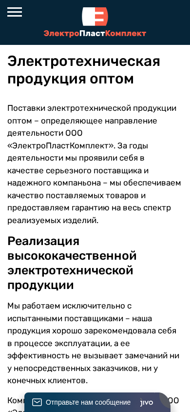 SEO-описание | «ЭлектроПластКомплект» – это компания, которая занимается продажей электротехнической продукции. У нас – электротехническая продукция в большом ассортименте. |